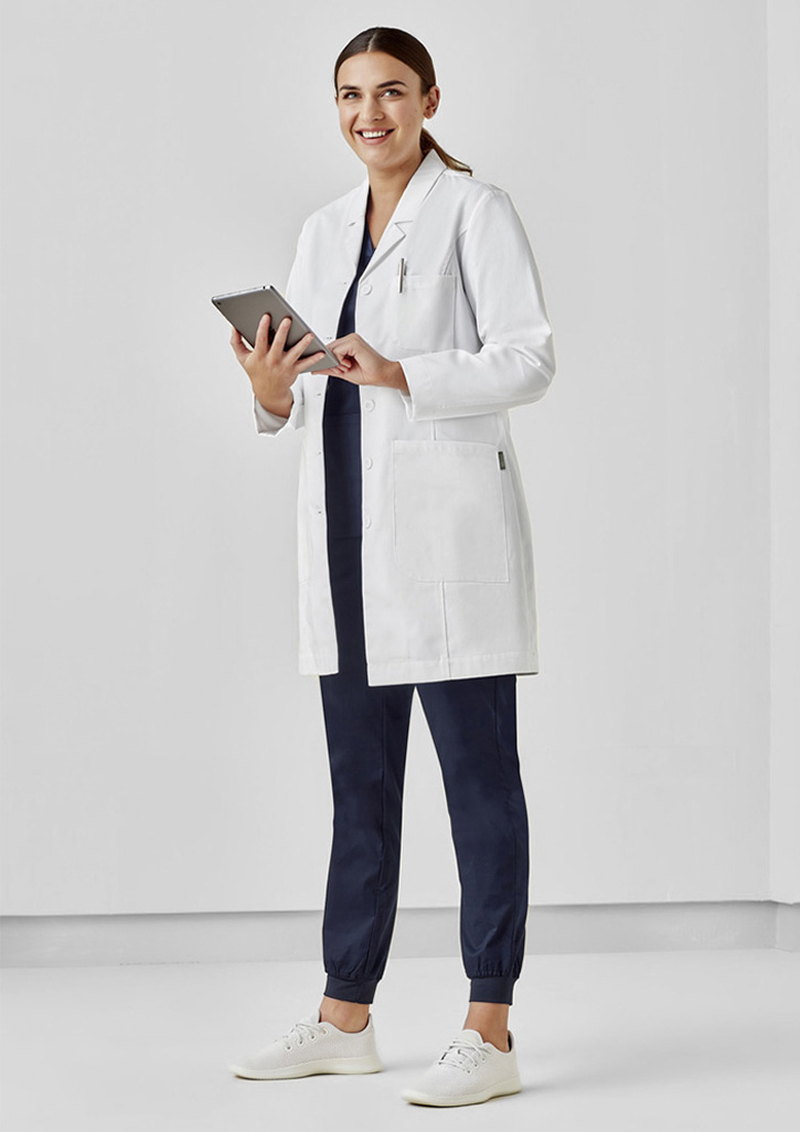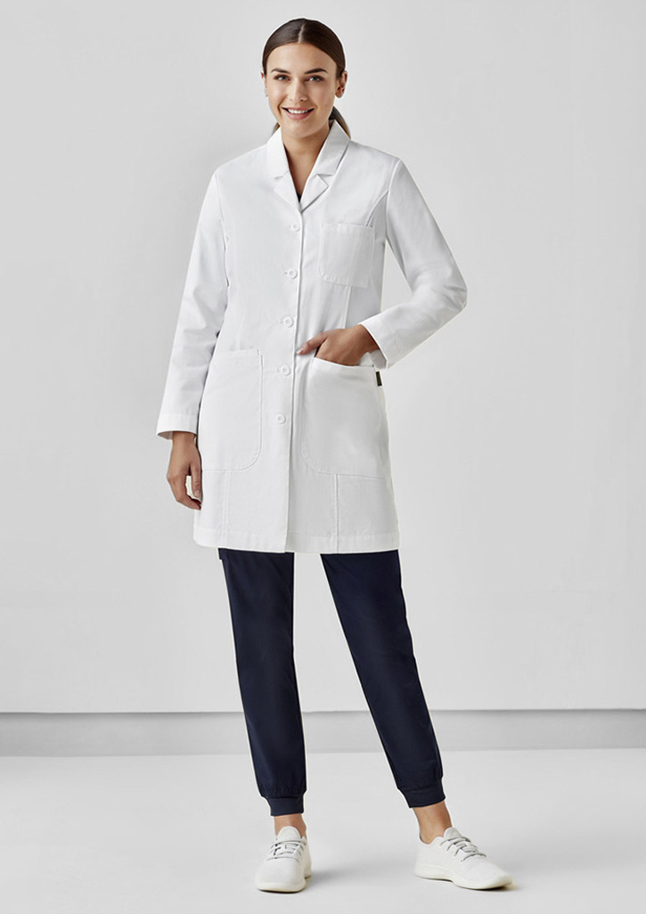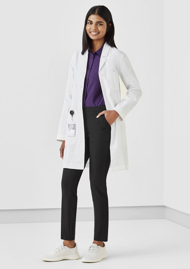 Princess seam that runs through the front and back for added shape – less boxy lab coat look